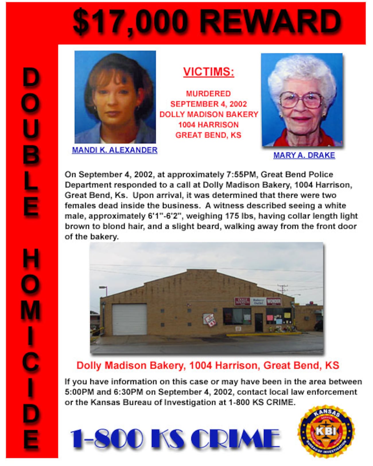 Anyone with information on the unsolved homicides of Mandi K. Alexander and Mary A. Drake, or anyone that may have been in the area of the Dolly Madison Bakery between 5:00 p.m. and 6:30 p.m. on September 4, 2002, is asked to contact the Great Bend, Kansas Police Department at 620-793-4120, Great Bend Crime Stoppers at 620-792-1300 or the Kansas Bureau of Investigation at 1-800-KS CRIME.